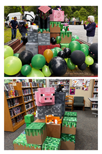 Level Up at the Library - The Library participates in the town Memorial Day Parade every year with a float based on the iRead theme. This year all about Minecraft! We reuse the decorations throughout the library all summer.