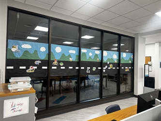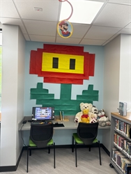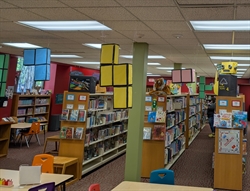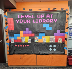Rock Island Public Library branch staff also leveled up the summer reading theme decor, creating fun and playful displays from the Level Up at Your Library theme. From Minecraft flowers to a racing wall, and an eye-catching Level Up at Your Library display case repurpose, the decor reminded patrons to sign up for summer reading.
